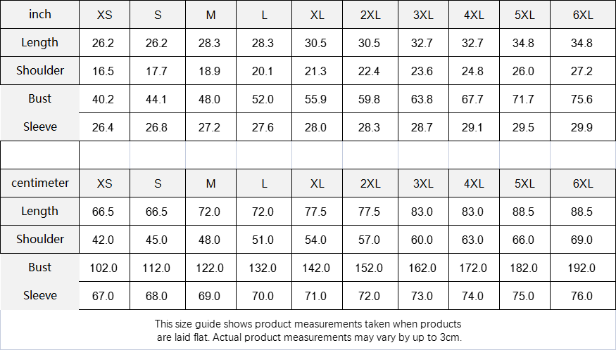 | Centimeter | XS | S | M | L | XL | 2XL | 3XL | 4XL | 5XL | 6XL |